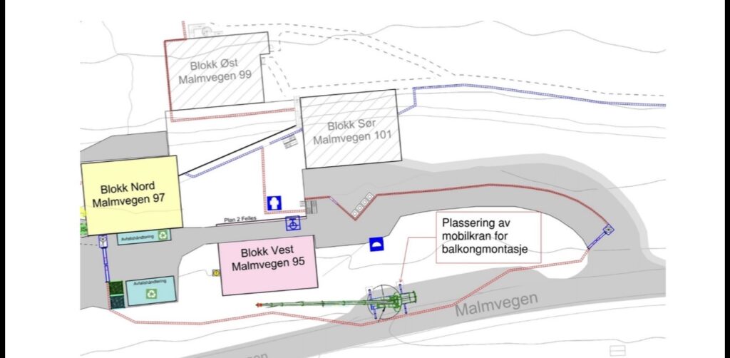 De skal i gang med balkongmontasje på vestblokken, og som følger av dette kommer mobilkranentil å stå i Malmvegen. Kranen blir fjernet så snart balkongsmontasjen er ferdigstilt.